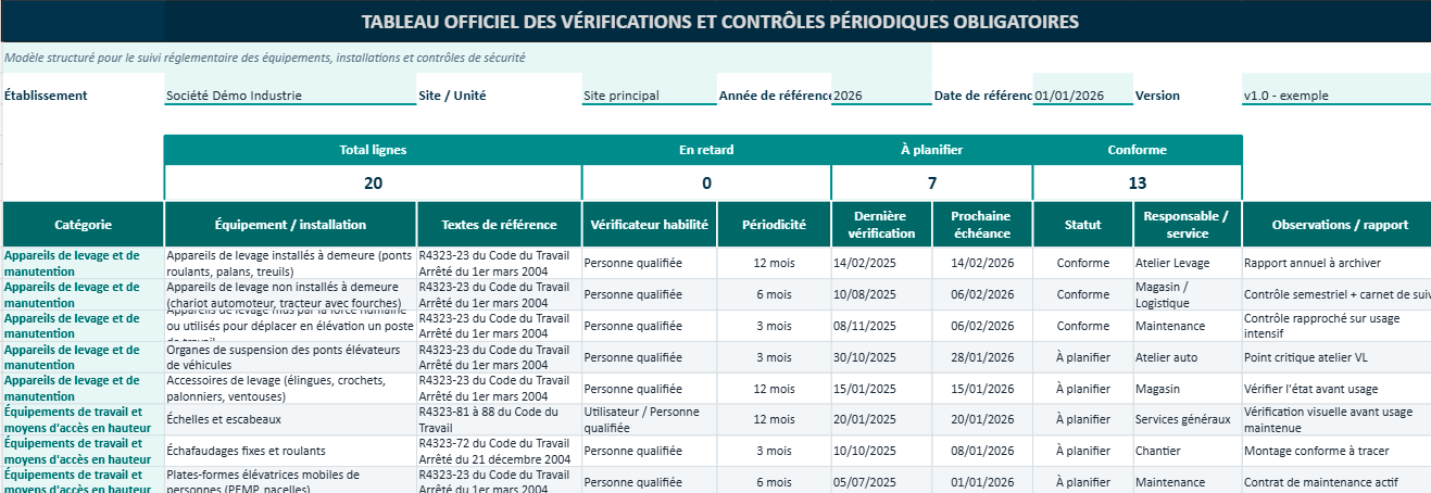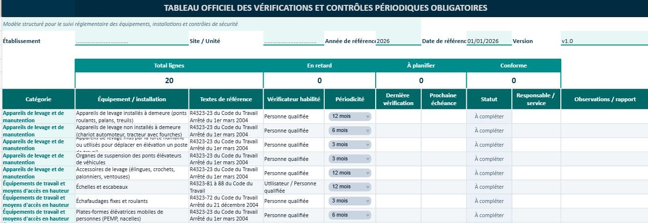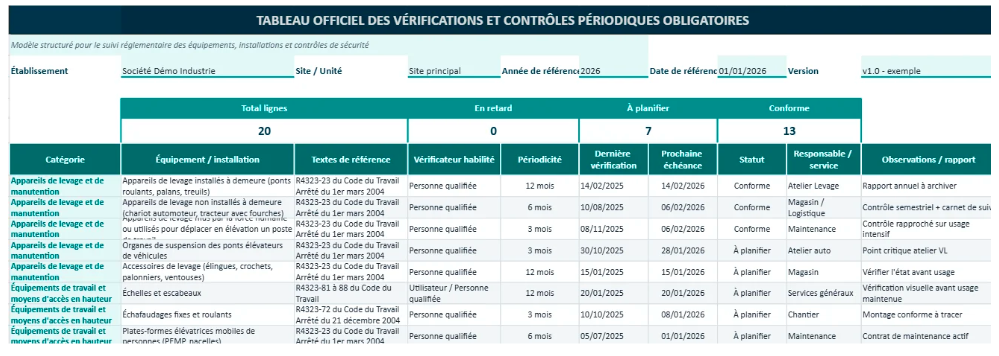 Prévoyez au minimum les colonnes suivantes : équipement, localisation, référence réglementaire, périodicité, dernier contrôle, prochain contrôle, vérificateur, résultat, action corrective et statut. Une présentation claire rend le tableau plus simple à exploiter tout au long de l’année.