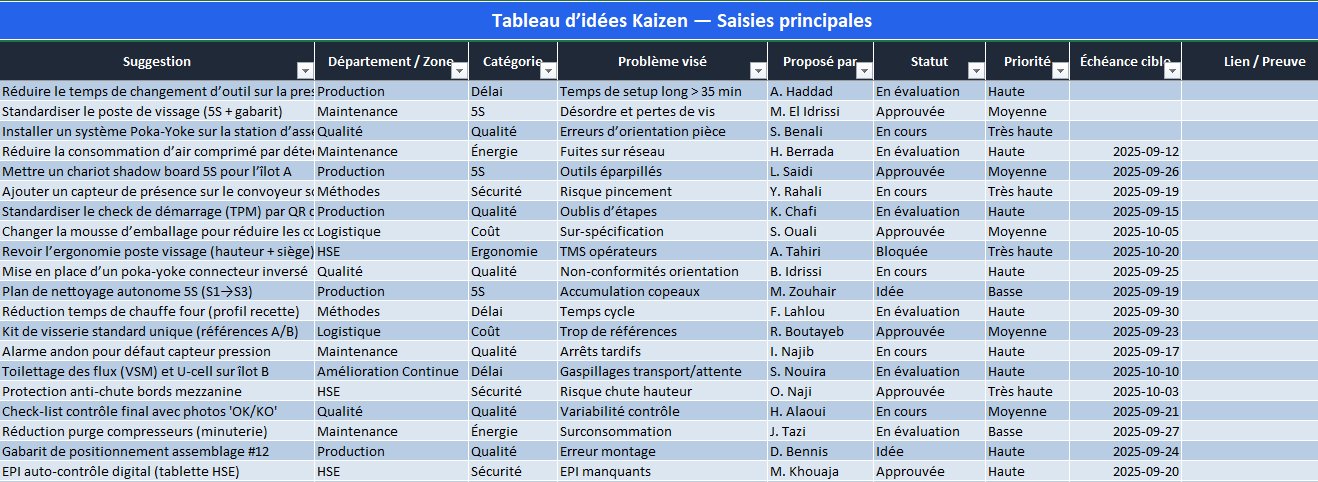 Le Kaizen ne vit pas dans les slogans : il prospère lorsqu’on capte les idées du terrain, qu’on les priorise avec rigueur, et qu’on mesure les résultats sans complaisance. Le modèle Excel fourni (« Tableau d’idées Kaizen ») a été conçu exactement pour cela : transformer un flot de suggestions en un portefeuille d’actions pilotées, visibles et rentables.