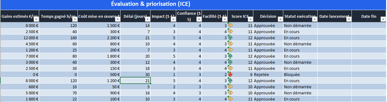 - Champs : ID → Suggestion auto, Responsable, Gains estimés €/an, Temps gagné, Coût, Délai (j), Impact/Confiance/Facilité (1–5), Score ICE, Décision, Statut d’exécution, Dates.
