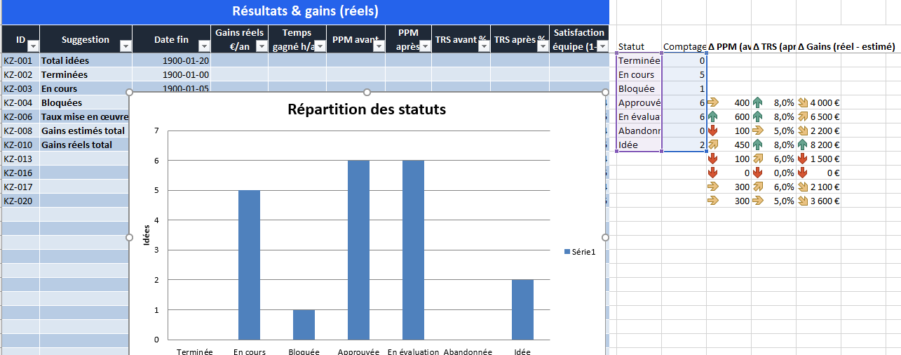 Centraliser les suggestions Kaizen, les prioriser (ICE) et mesurer les gains réels (PPM, TRS, €) dans un seul fichier, lisible et actionnable.