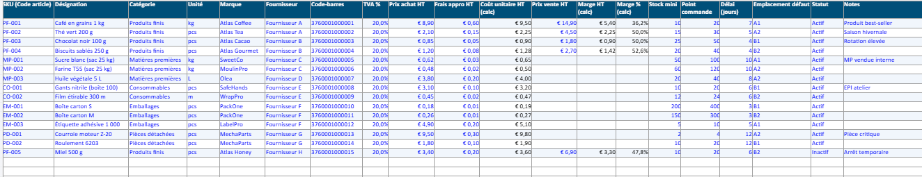 | 002 | Cahier A4 | Papeterie | Oxford | 50 | Pièces | 1.20 € | 60 € | 2024-03-25 | Etagère B | Fournisseur B | LOT002 | N/A | |