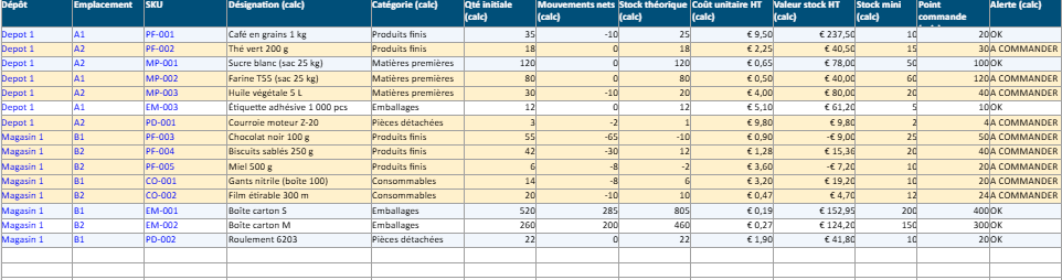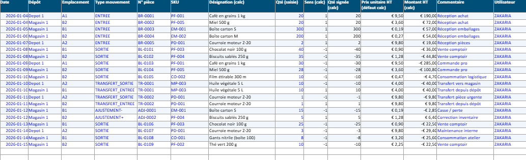 La feuille Mouvements est là pour raconter l’histoire du stock, au fil des jours. Réceptions, sorties, ajustements, transferts : chaque ligne apporte une preuve, une trace, un contexte. Et c’est cette discipline-là qui évite les surprises. Au lieu de chercher d’où vient un écart, on le comprend. Au lieu de deviner, on vérifie.