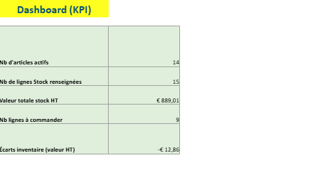 Pour les moments où l’on compte réellement — sur l’étagère, au dépôt, en magasin — la feuille Inventaire permet de comparer le théorique au physique, de noter les écarts, d’indiquer un motif, et de garder une trace propre. Enfin, le Dashboard donne une vue rapide : ce qui pèse le plus en valeur, ce qui manque, ce qui doit être surveillé.