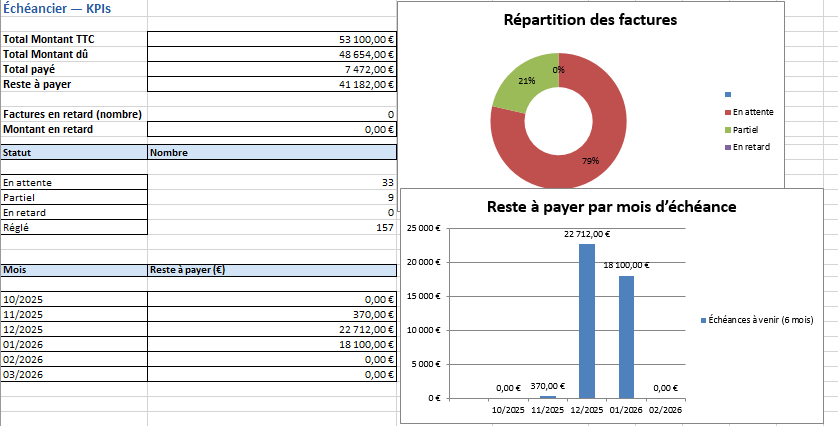 - Excel (Échéancier…) reste la source de vérité : vous saisissez les lignes, les paiements et les dates. Les KPI & graphes se mettent à jour.