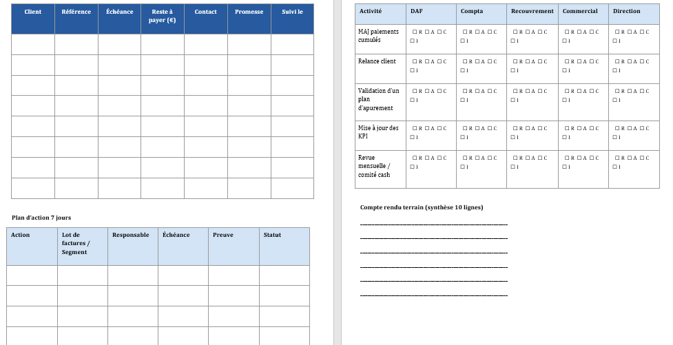 - Word : plan d’action = “relance téléphonique + mail” pour les 10 plus gros, responsable Recouvrement, échéance J+2, preuve = CR d’appel.
