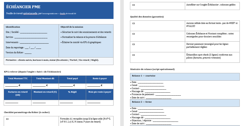 Service comptable débordé le lundi matin, commerciaux en route et téléphone qui sonne pour une commande urgente : l’échéancier de paiement devient la colonne vertébrale de la journée. Ouvert en premier, il révèle le pipeline des encaissements, les retards à dix jours, les dossiers partiels à sécuriser. Le DAF balaie le reste à payer et cale les priorités ; le chargé de recouvrement ouvre les fiches “En retard”, lit la date d’échéance, vérifie le dernier paiement et déclenche la séquence de relance. La magie n’est pas dans la feuille elle-même, mais dans la régularité d’alimentation et la lecture commune par tous les métiers.