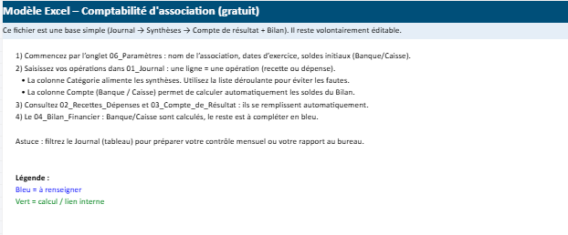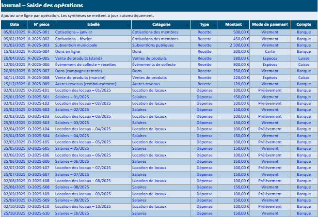 Ce classeur a été conçu pour tenir une comptabilité associative simple, lisible et exploitable, à partir d’un journal d’opérations unique. Une fois les lignes saisies, les synthèses, le compte de résultat et le bilan se mettent à jour automatiquement, sans retraitement manuel.