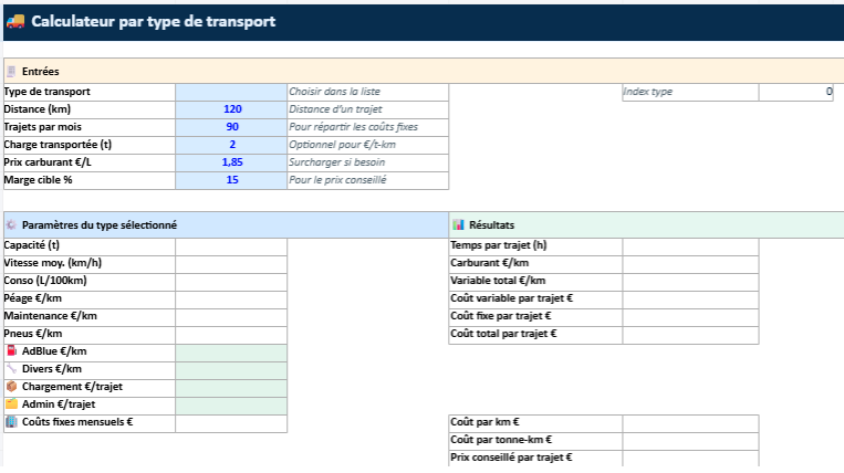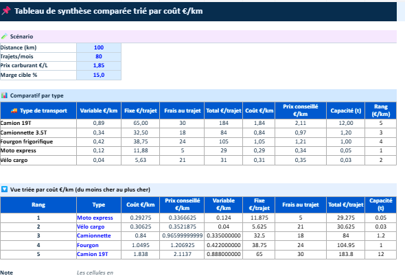 Il calcule le coût de revient du transport par type, puis le ramène en coût par trajet et coût au km. Il propose aussi un prix conseillé si vous indiquez une marge cible.