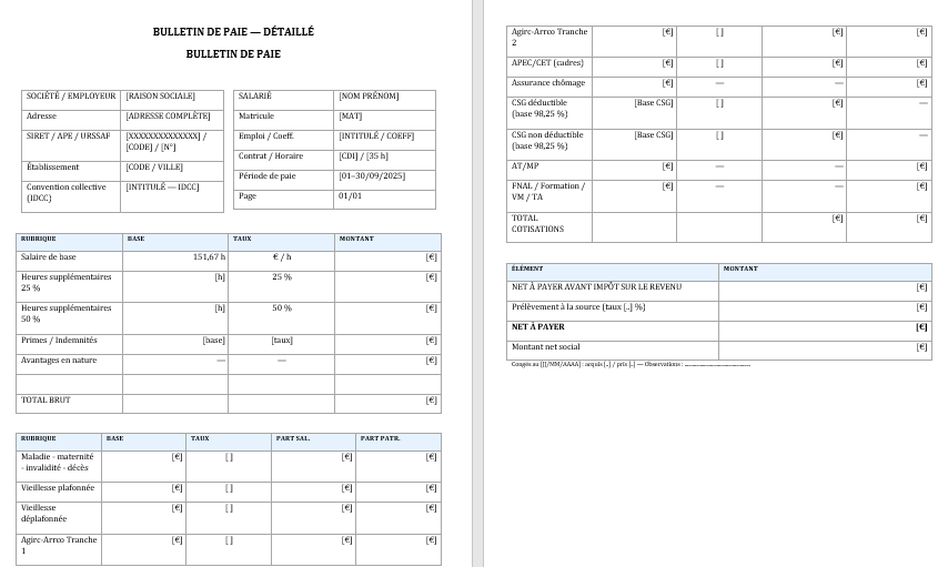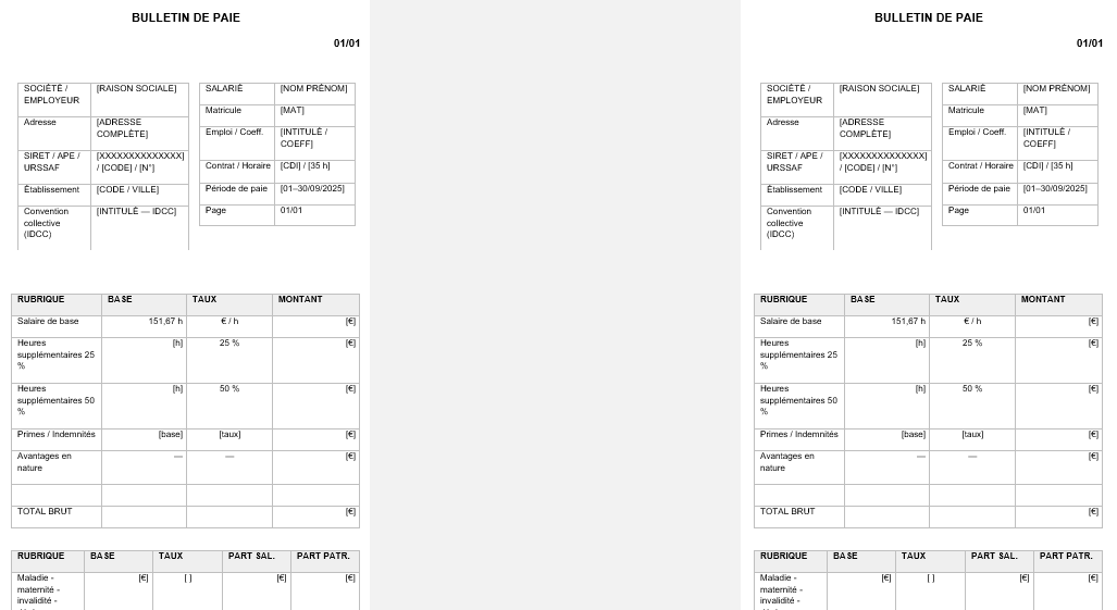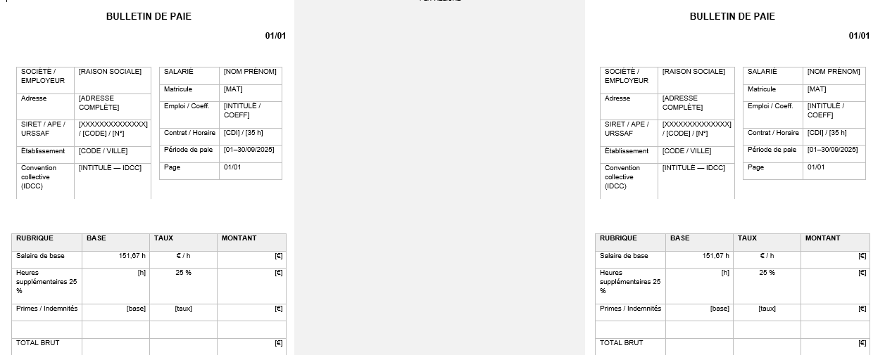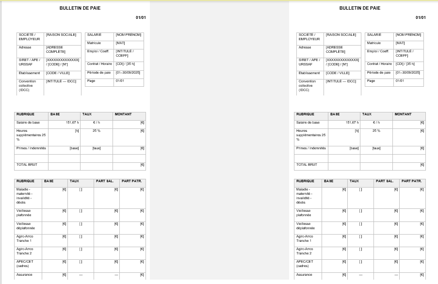 Ces trames sont pédagogiques et modifiables : adaptez-les à votre convention collective, vos taux AT/MP, et vos paramètres URSSAF/Agirc-Arrco. Pour des cas particuliers (apprentis, cadres, primes spécifiques), complétez les rubriques prévues.