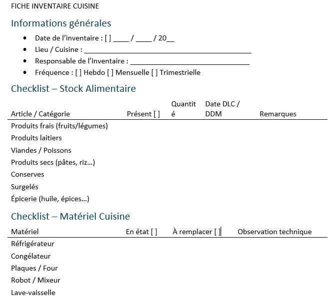 - Une fiche d’inventaire cuisine bien structurée et complète est un outil de conformité, de gestion et d’anticipation.