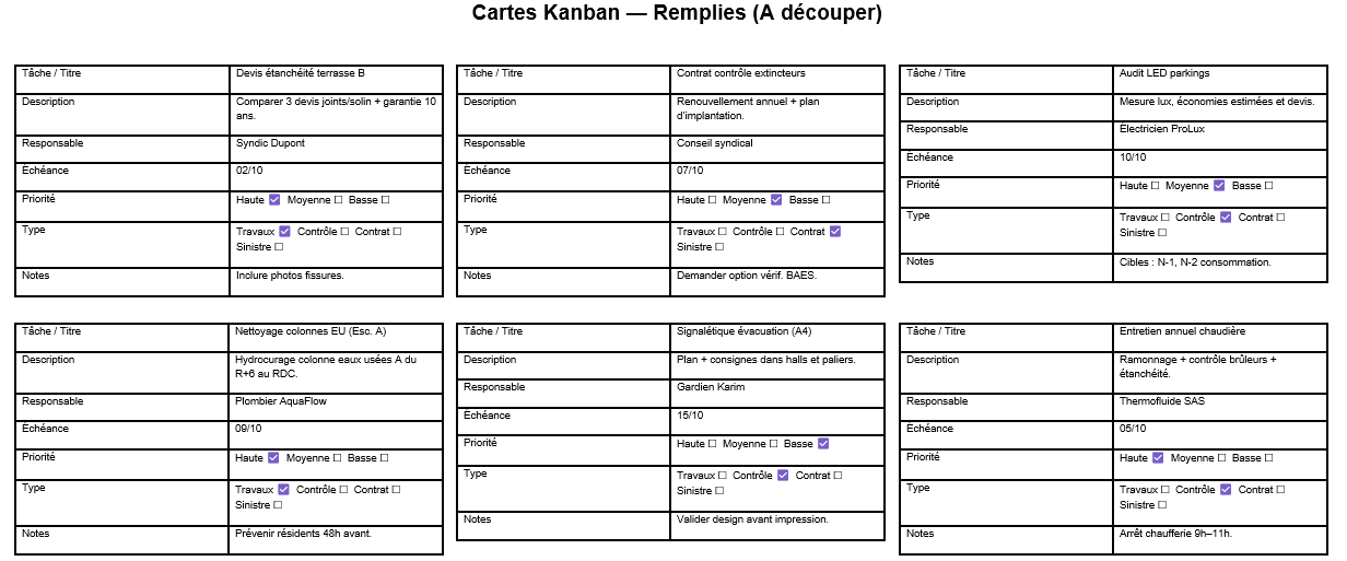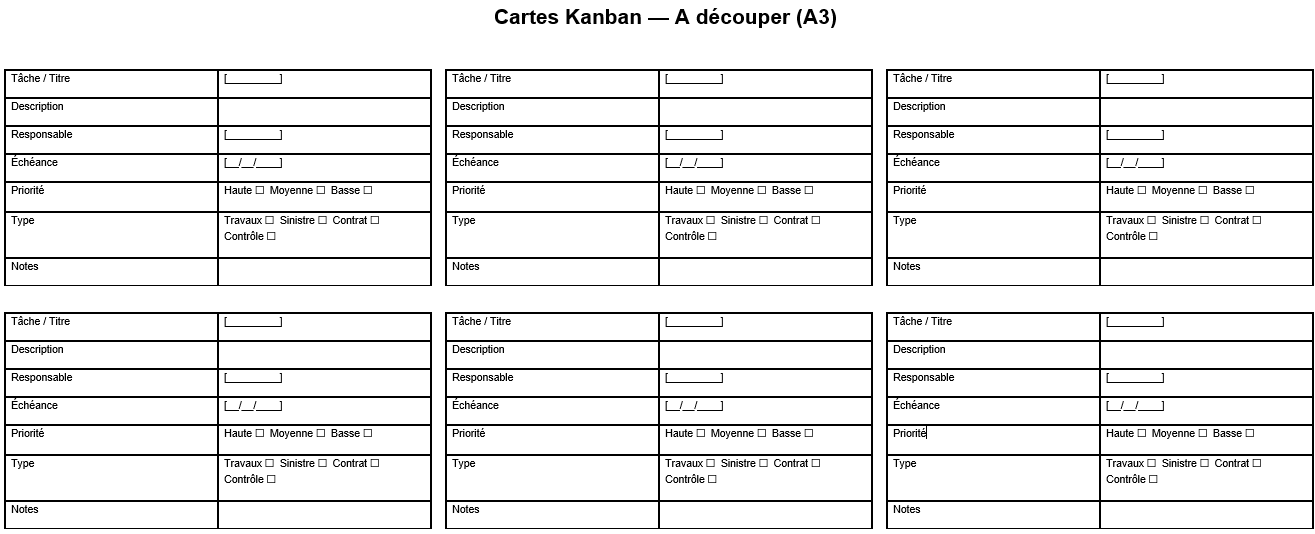 - Feuille de cartes (18 cartes à découper : Titre, Description, Responsable, Échéance, Priorité, Type, Notes).