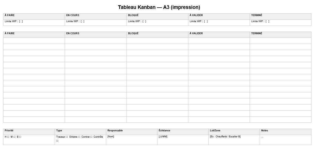 - Tableau principal en A3 paysage (5 colonnes : À faire • En cours • Bloqué • À valider • Terminé + ligne de limites WIP).
