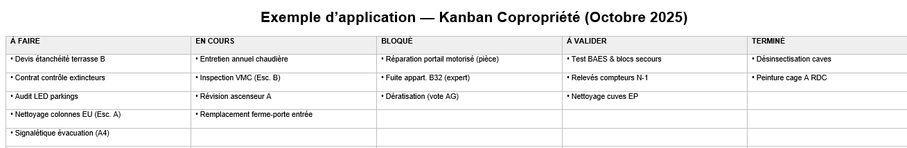 - Blocages récurrents : comptez les causes (pièce en attente, vote, devis…) et traitez les 2 plus fréquentes.