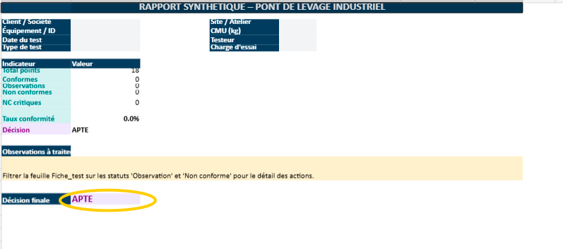 Dans certains cas, le diagnostic est simple : l’équipement fonctionne correctement, les contrôles sont satisfaisants et aucune anomalie notable n’apparaît. Dans d’autres situations, la conclusion demande plus de nuance. Le pont peut rester utilisable, tout en montrant des signes d’usure ou des écarts qui imposent une surveillance renforcée ou une intervention planifiée. Enfin, certaines anomalies rendent l’équipement impropre à l’usage tant qu’une réparation n’a pas été effectuée.