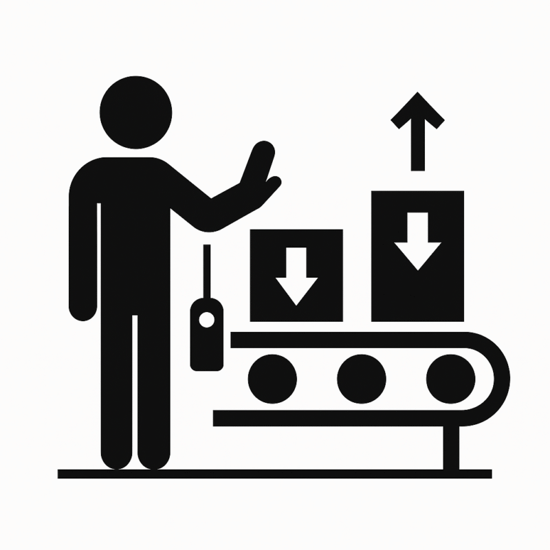 Ce geste indique l’arrêt du convoyeur ou l’interruption momentanée du flux.