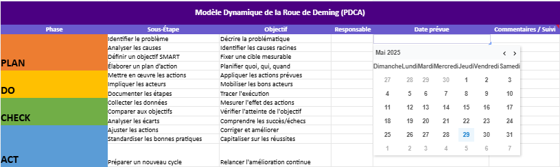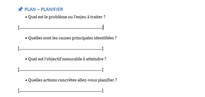 - Plan (Planifier) : Identifier un problème, analyser les causes, définir des objectifs et un plan d’action.