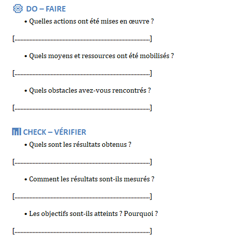 PHASE Questions clés Objectif PLAN – Les objectifs sont-ils précis et mesurables? Sont-ils alignés avec la stratégie? Vérifier la préparation et l’orientation DO – La mise en œuvre respecte-t-elle le plan d’action? Les ressources et rôles sont-ils correctement attribués? Évaluer la réalisation effective CHECK – Des indicateurs sont-ils suivis régulièrement? Les écarts sont-ils identifiés et analysés? Jauger la performance ACT – Des actions correctives sont-elles engagées? Les bonnes pratiques sont-elles capitalisées? Le processus est-il réajusté? Mesurer la capacité à progresser