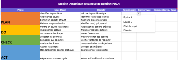 - Act (Agir) : Ajuster les actions, corriger les écarts et standardiser ce qui fonctionne.