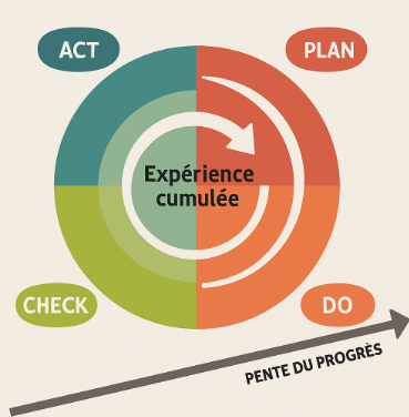 Cela symbolise l’amélioration continue : chaque cycle PDCA permet d’apprendre de l’expérience précédente, d’améliorer un processus, puis de repartir sur une base plus élevée.
