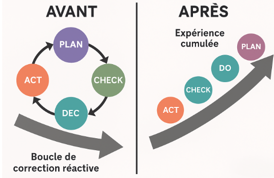- PDSA (Plan-Do-Study-Act) : Variante centrée sur l’apprentissage plutôt que sur le simple contrôle.