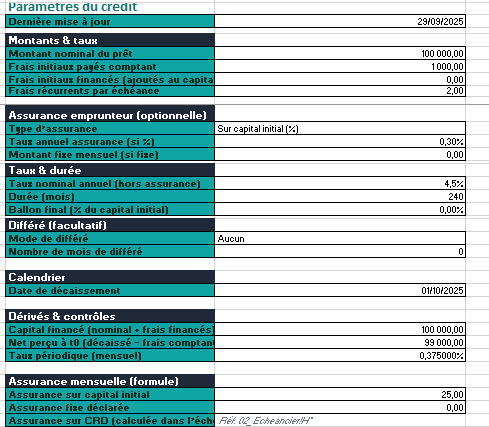 Contrôlez les dérivés (capital financé, net perçu, taux mensuel) et 02_Echeancier (CRD, intérêts, assurance, frais).
