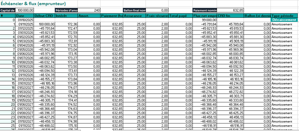 #, Date, CRD début, Intérêt, Amort., Mensualité (hors ass./frais), Assurance, Frais récurrents, Total payé, Flux net emprunteur, CRD fin, Ballon (si dernier), Type période.