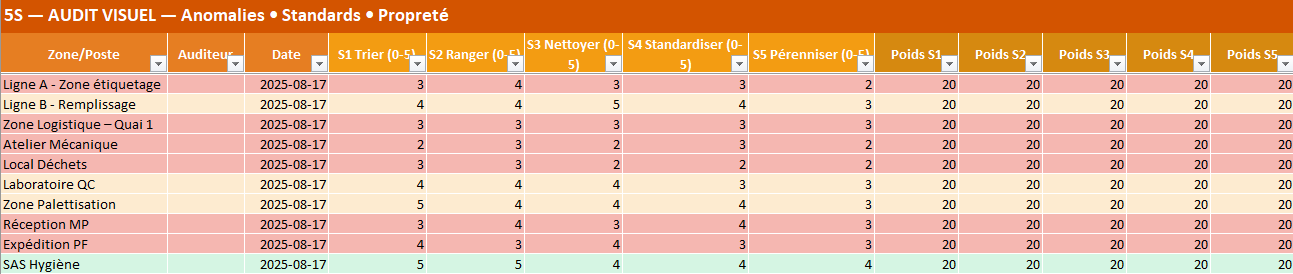 - S1…S5 (0–5) : notes par pilier (Trier, Ranger, Nettoyer, Standardiser, Pérenniser).