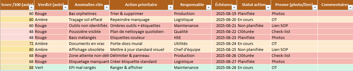 - Des notes variées générant des verdicts Rouge/Ambre/Vert, avec actions (ex. Repeindre marquage, Standard visuel à jour, Plan de nettoyage quotidien), responsables, échéances et preuves.