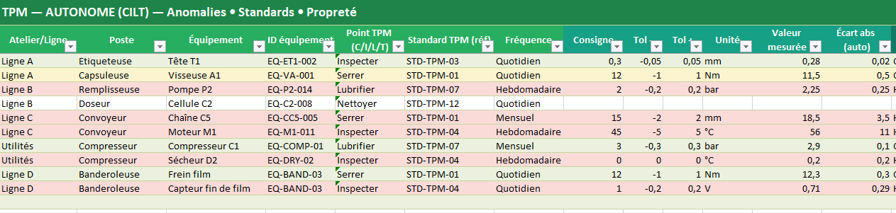 Dans votre fichier, l’onglet TPM_Autonome calcule l’écart et la conformité automatiquement et colore les lignes.