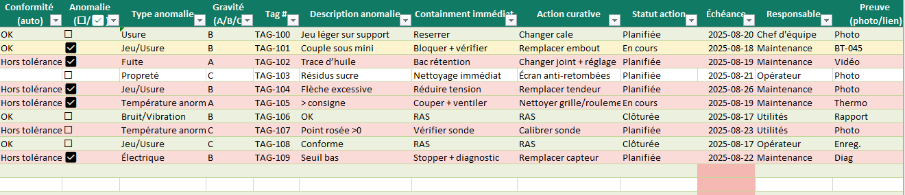 - Mise en forme : lignes en rose si Hors tolérance, alerte rouge si échéance dépassée ; comptages KPI (hors tolérance, anomalies ☑, actions en retard, répartition A/B/C).