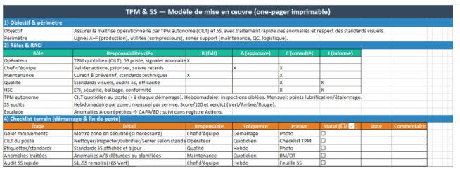 - TPM_5S_Mise_en_Oeuvre : one-pager imprimable (Objectif, RACI, Routine, Checklist avec cases, Légende, KPI hebdo).