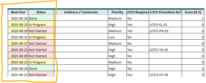 - La réunion hebdo tient 30 min : on regarde Overdue / Due in 7 days / % Done / écarts LOTO, on décide, on met à jour les standards.
