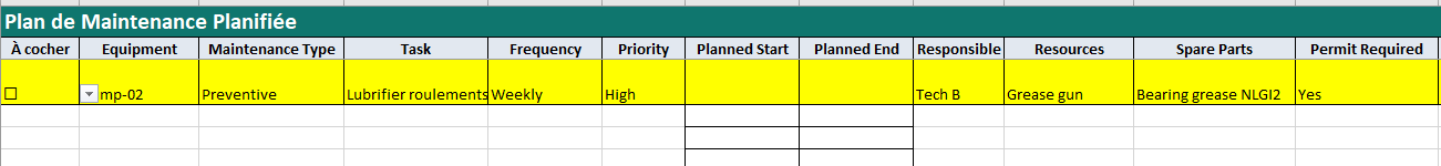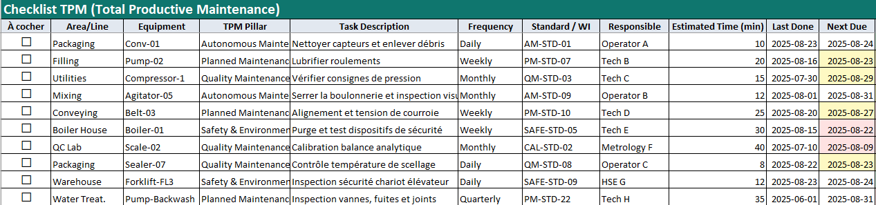 - Construire la TPM_Checklist (qui, quoi, quand), puis fixer les dates de dernier passage.