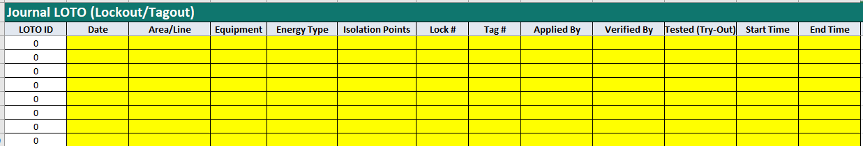 BS-EL-###). - LOTO_Log : journal complet (atelier, énergie, try-out, heures, statut), ID auto daté (ex.