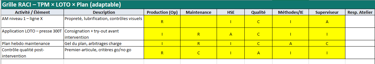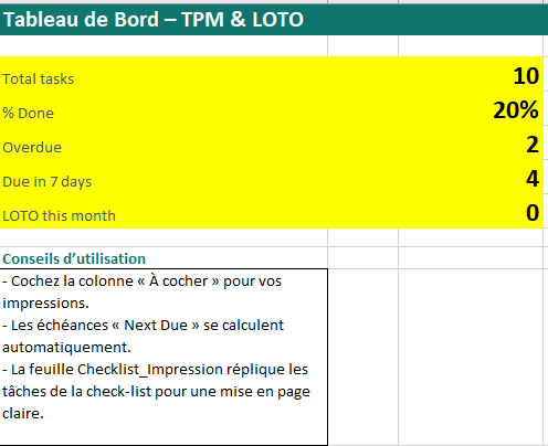 TPM, maintenance planifiée et LOTO : Modèle Excel – Checklist, Grille RACI, Audit Croisé, Tableau de Bord