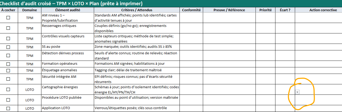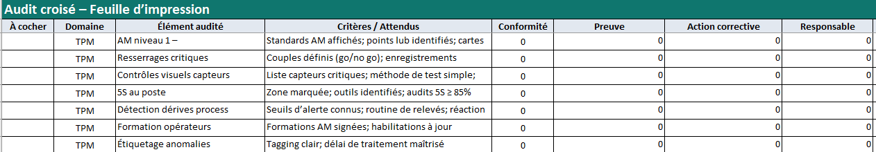 - Contenu prêt à l’emploi : 24 items préremplis (8 TPM, 8 LOTO, 8 Plan) avec critères concrets.
