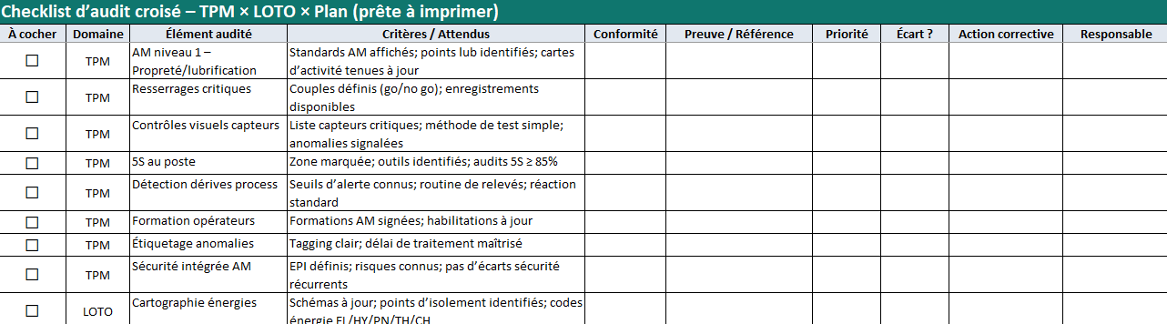 Checklist d’audit croisé (TPM × LOTO × Plan)