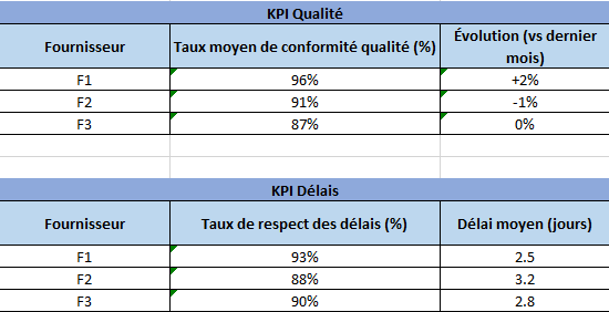 Architecture d’un tableau de tracking fournisseur avec KPI qualité / délai