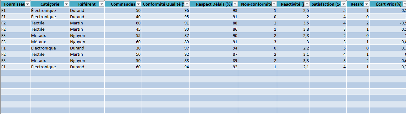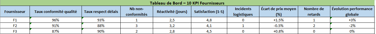Tableau Excel de suivi des fournisseurs, enrichi de KPI qualité/délai ⬇️