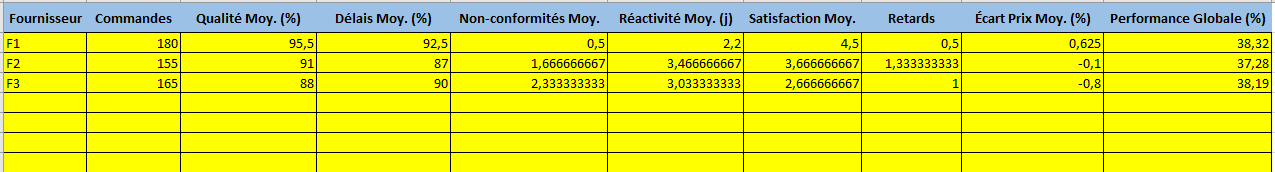 Tableau Excel de Suivi et de Comparaison Automatisée des Fournisseurs – Indicateurs Qualité, Délai et Performance Globale