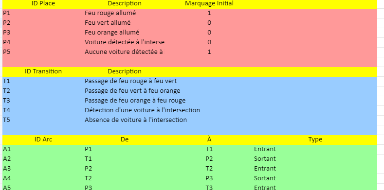 L’image ci-dessus montre une représentation visuelle du modèle de Réseaux de Petri pour un système de contrôle de feux de circulation, organisée comme elle pourrait l’être dans un tableur Excel. Cette illustration inclut les sections distinctes pour les Places, Transitions, et Arcs, ainsi que la visualisation graphique des éléments du Réseau de Petri avec des cercles pour les places, des rectangles pour les transitions, et des flèches indiquant les flux entre eux.