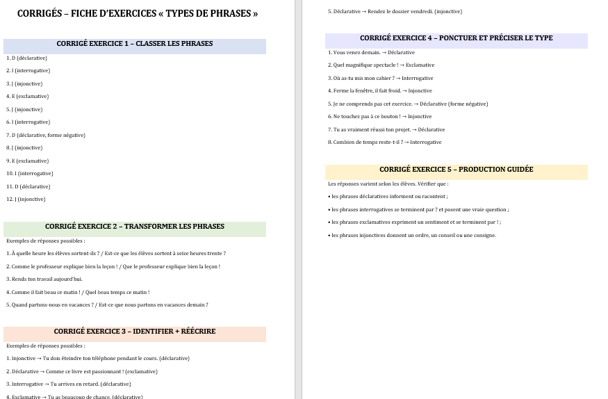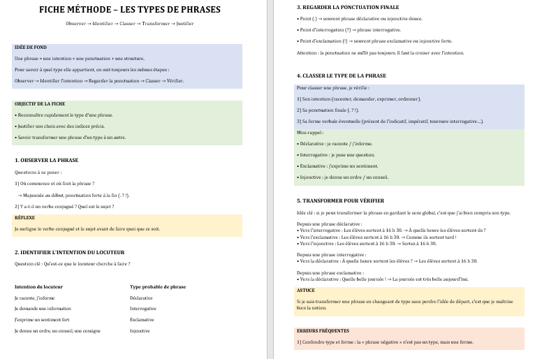 Ainsi, la fiche ne se limite pas à définir les types de phrases ; elle installe une habitude de lecture active et une posture d’enquêteur devant chaque phrase. C’est cette habitude – plus que la leçon elle-même – qui aide les élèves à écrire, à se relire et à corriger leurs productions avec davantage d’autonomie.