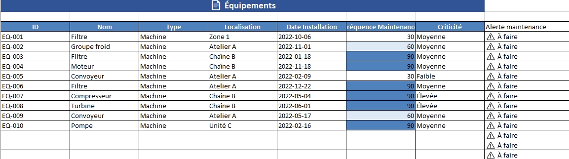 | Fiche équipement | Fiche technique avec numéro, localisation, fréquence, criticité |
