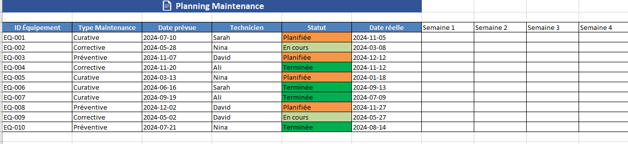 Cette feuille propose une vision planifiée des maintenances à venir. Ses fonctionnalités incluent :