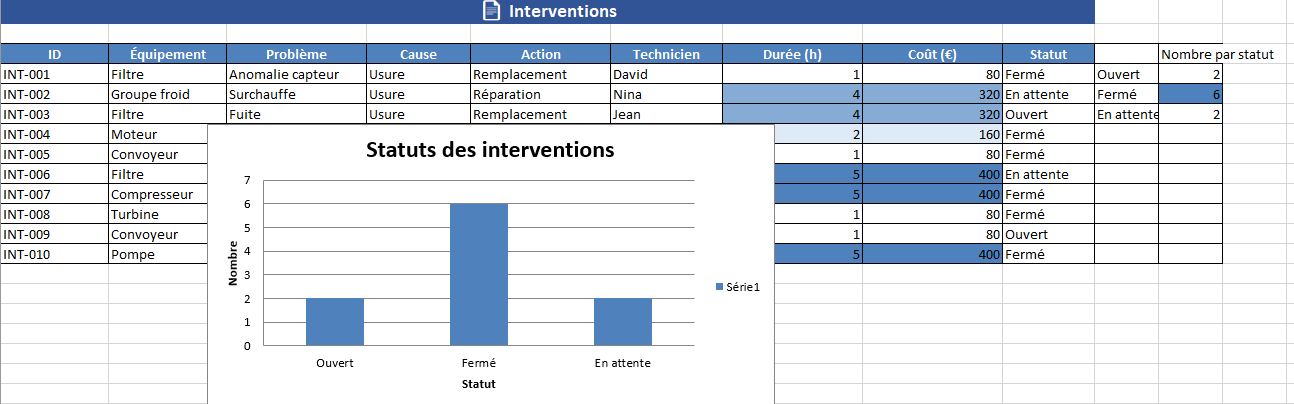 - Tableaux croisés dynamiques : pour regrouper les interventions par équipement, zone ou technicien