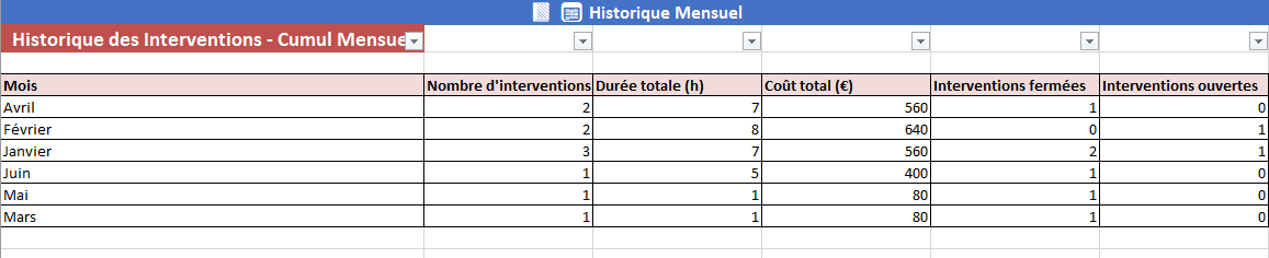 - Historique Mensuel Cumulé : calcule le nombre d’interventions, les durées et coûts totaux par mois