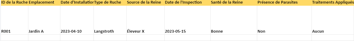 Un modèle de fiche de suivi de ruche peut inclure les éléments suivants :