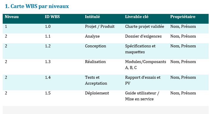 - Carte WBS par niveaux (5 colonnes : Niveau, ID, Intitulé, Livrable clé, Propriétaire)