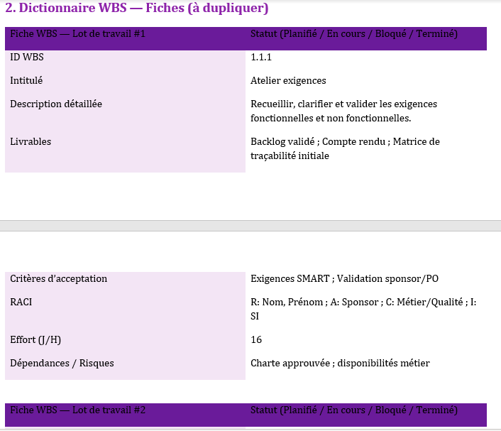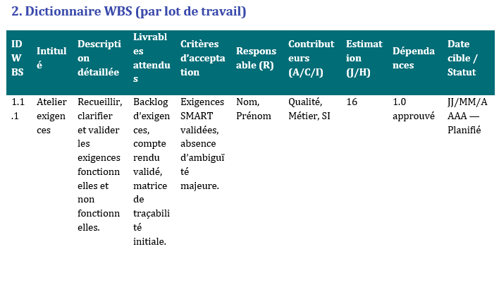 - Dictionnaire WBS (10 colonnes : ID, Intitulé, Description détaillée, Livrables, Critères d’acceptation, R, A/C/I, Estimation J/H, Dépendances, Date/Statut)