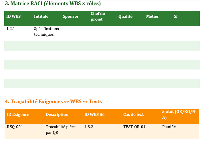 - Traçabilité Exigences ↔ WBS ↔ Tests (5 colonnes : ID Exigence, Description, ID WBS lié, Cas de test, Statut)